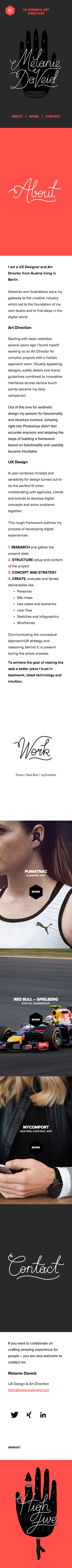 Melanie’s idea to serve a one-page layout with a seamless integration of her work faced us with the challenge to preserve access to other projects while viewing a project case study in detail. After sketching different ideas and prototyping the most feasible ones we finally came up with an approach to inject project case studies without loosing the red line and preserve the overall simplicity of the site. We spend a lot of time finding the best workflow and transitions to switch the interface from a list of projects to the view of a single case study and vice versa.