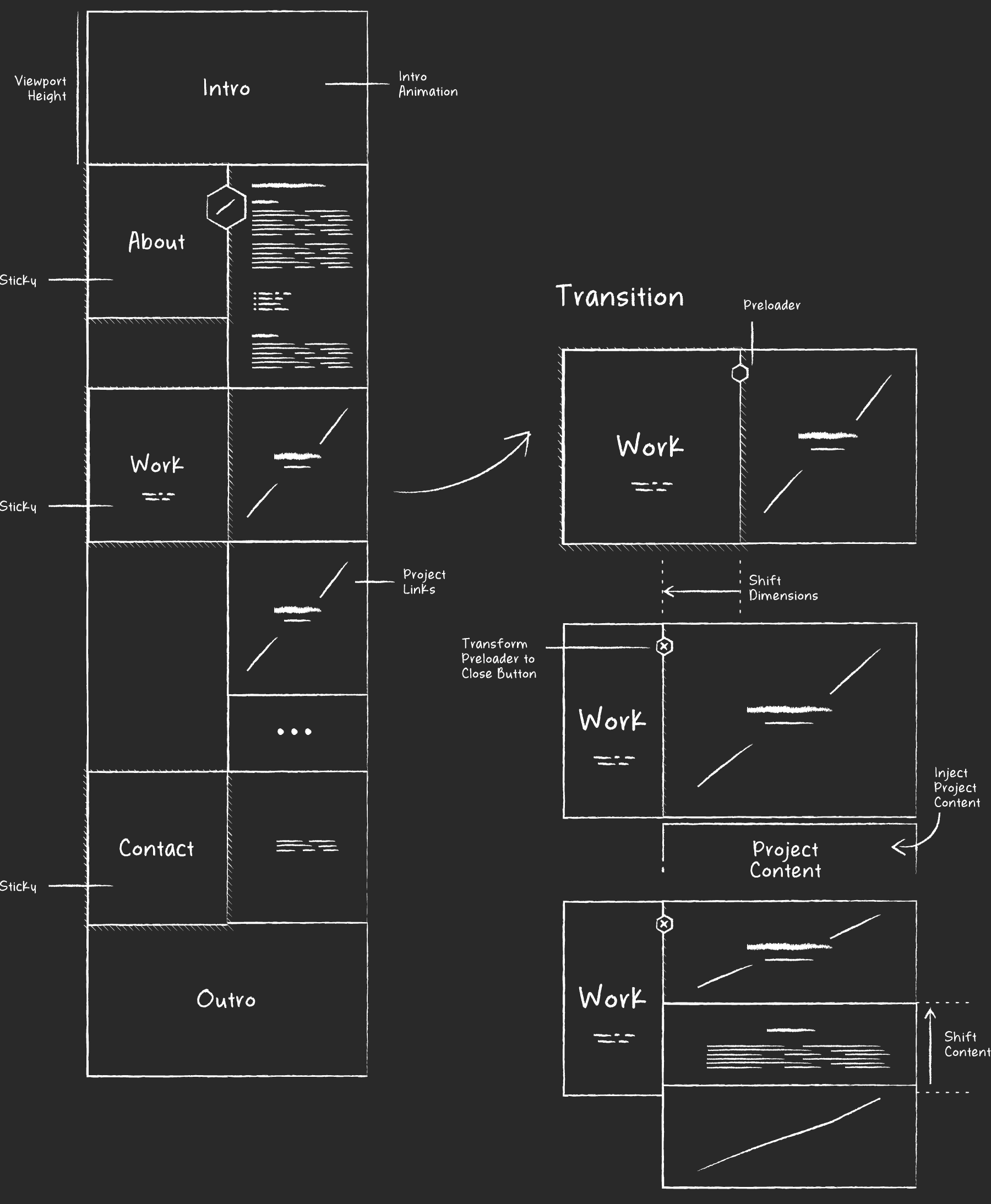 While we both have been coming across some great line animations on websites already, we were pretty stoked by the outcome of our very first rough version. Fine-tuning the timing and overall transition durations took plenty of time but from that point on we knew that every bit we are adding will be totally worth it.